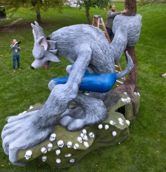 (芝加哥時報快訊) 两位卓越的芝加哥西郊藝術家本周在Naper遺址(Naper Settlement)共同增添了一座15英尺高的狼人雕塑,為其年度萬聖節活動增添歡樂。這座雕塑由瑞柏市(Naperville)藝術家保羅·庫恩(Paul Kuhn)和奧羅拉(Aurora)藝術家盧克·薩爾文森(Luke Salvesen)創作,將在Naper遺址的萬聖節前夕(All Hallows Eve)活動以及10月27日和28日的成人活動「嚎叫在月亮下」(Howlin’ at the Moon)中高高聳立於來賓之上。這座狼人雕塑是在星期三安裝的,以迎接這些活動。