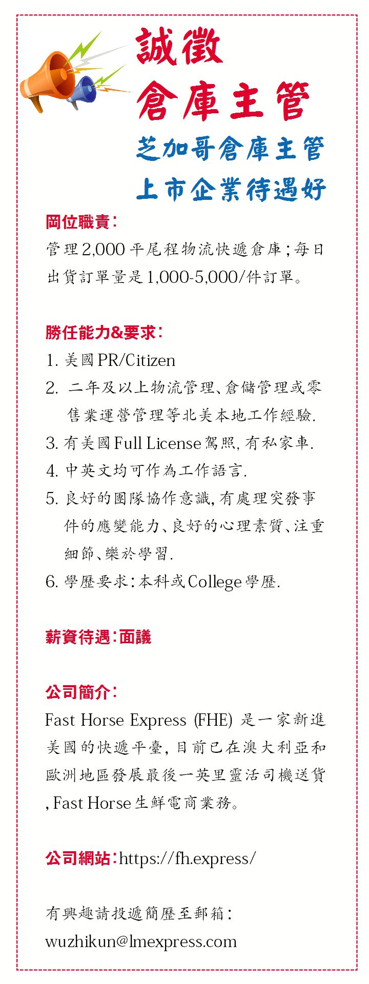 芝加哥頭條上市企業徵倉庫主管! Share this: Share on X (Opens in new window) X Share on Facebook (Opens in new window) Facebook Like Loading... Related