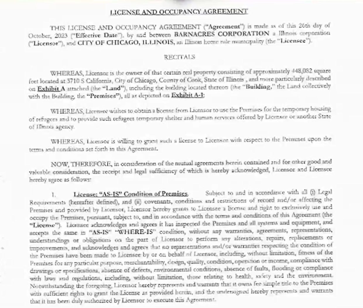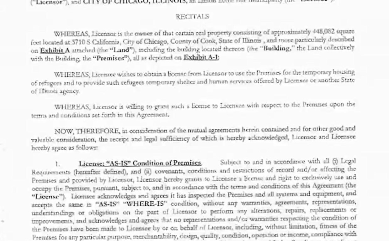 芝加哥市政府已與空地擁有者簽訂土地使用合約,為移民提供臨時住宿。合約條款為期六個月,月租91,400美元,並可能延長時間,費用可能增加3%。