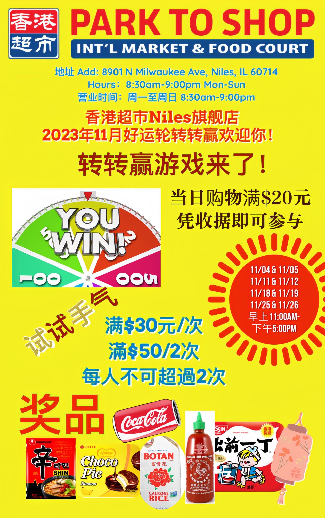 (芝加哥時報訊)秋天是一個感恩的季節,秋天更是一個豐收的季節。香港超市Niles旗艦店為慶祝本店開張,將於2023年11月起,每個週六和週日為當天來店內消費的客戶舉行「好運輪轉轉贏」遊戲。