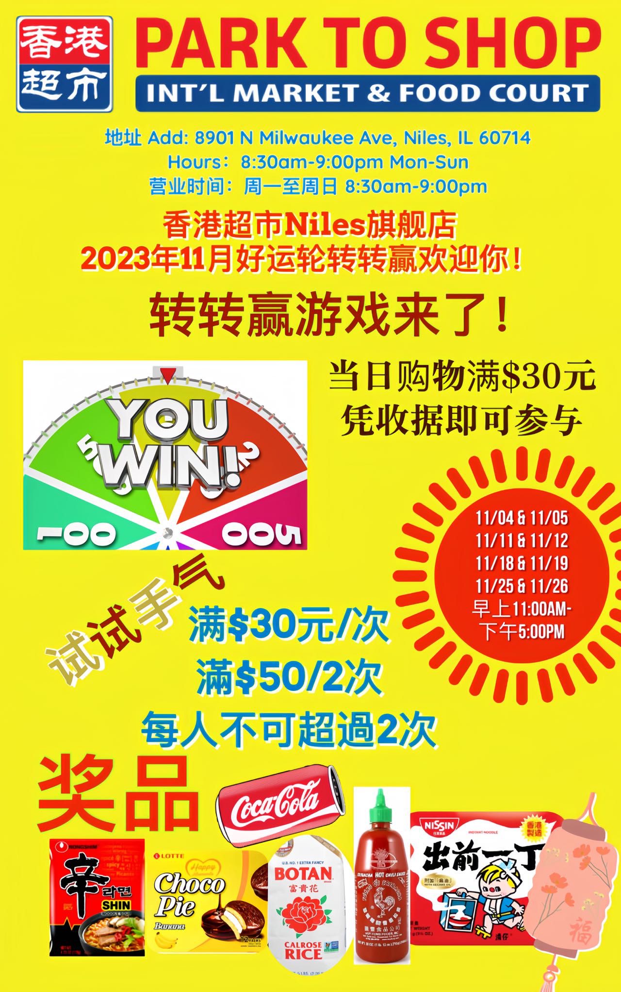 以上活動凡是在香港超市Niles旗艦店消費滿$30,憑收據即可參加「轉轉輪盤遊戲」,