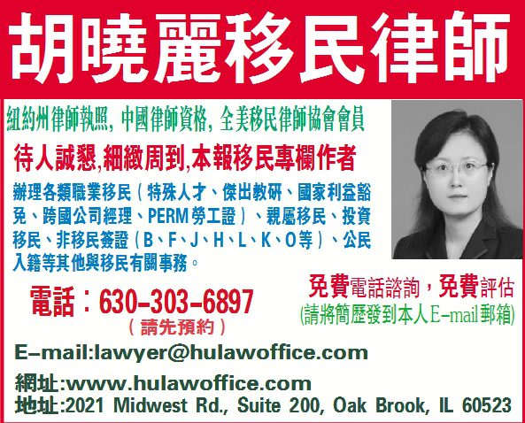 本文是胡曉麗移民律師為廣大華人社區提供的移民法律資訊,並非對個案的法律意見。如有問題,可打電話 (630) 303-6897咨詢,或發郵件到lawyer@hulawoffice.com 進行評估。本所辦公地點在芝加哥西郊:2021 Midwest Road, Suite 200, Oak Brook, IL 60523,網址:https://www.hulawoffice.com/,也可預約面談。
