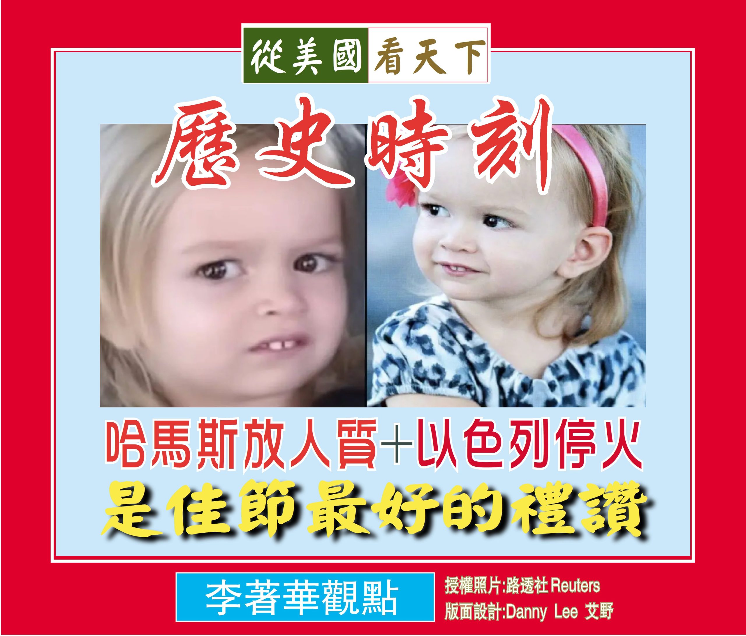 就在感恩佳節到來之際, 中東地區突然傳來了佳音–哈馬斯將釋放人質以交换以色列停火的協定。根據卡達外交部部長馬杰德·阿爾-安薩里表示,臨時停火將於週五早晨7點開始,下午4點左右將釋放13名婦女和兒童, 這真的是佳節最好的禮讚。