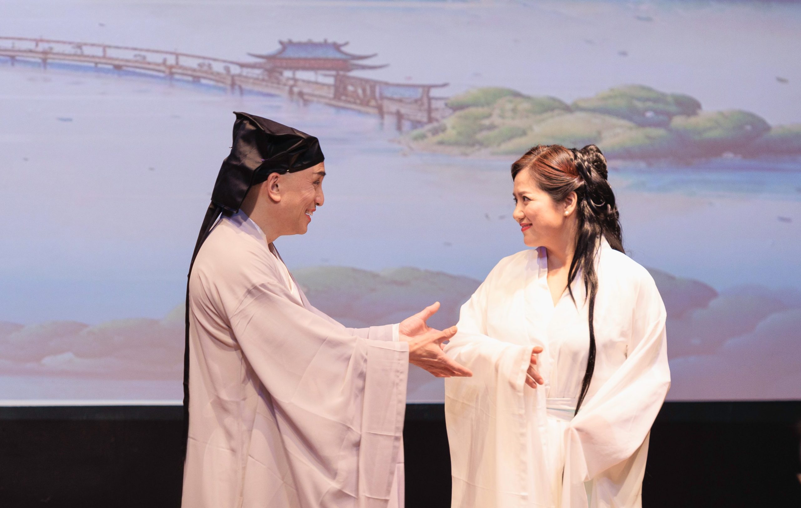接下来上演的是关于白蛇和许仙的爱情故事的短剧《千年就一回》。千年之前,白蛇被一位小牧童所救,千年之后白蛇修炼成人,决定以爱偿还救命之恩。然而,爱则爱矣,却是爱在心头口难开,黄海燕(饰演白蛇)将白蛇对许仙的欲说还休千回百转的爱情表现得极其细腻,或娇羞或犹疑或甜蜜,无不呈现得淋漓尽致,而由孙晓明饰演的青蛇则活泼可爱,生动俏皮,刘承熹饰演的许仙憨态可菊又诙谐。三位演员为观众呈现了一个别样的白蛇的故事,为观众带来了新奇的观剧体验。