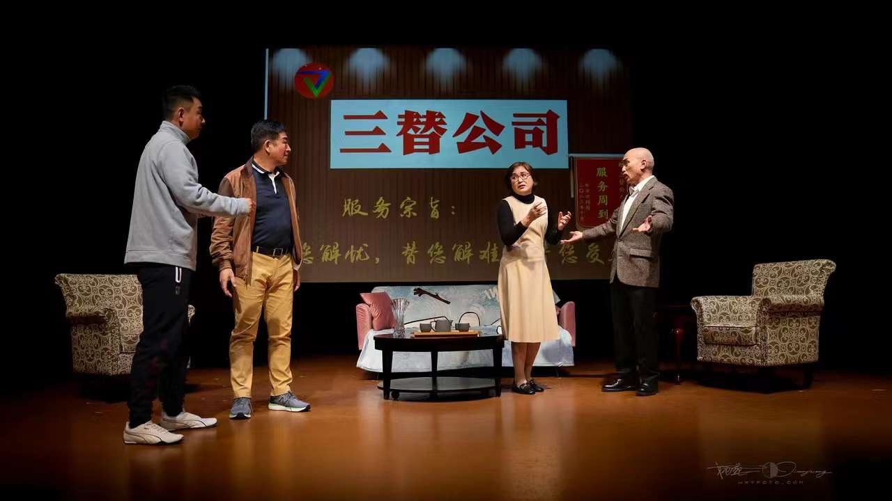 演出的最后一个剧目是荒诞短剧《三替公司》。三位不甘过平庸人生的球友一起成立了一家《三替公司》,公司因为接了替人约会和替人颁奖的活,而引发了一连串的笑话。五位演员(其中李莉扮演在出版社工作的李小姐,李力扬、刘承熹和牛明恺扮演三位公司创始人,李敏扮演作家)配合默契,精准地把握了喜剧的节奏,他们本着“一本正经地搞笑”的原则,将作品的荒诞气质进行了极致的表达。《三替公司》将演出推向高潮。在演员们不断抖落的包袱中,观众的笑声此起彼伏,整个剧场变成了欢乐的海洋。最后,演出在《三替公司》三位创始人极具喜感的舞蹈表演中,在观众热烈的掌声和欢呼声中,圆满落下帷幕。