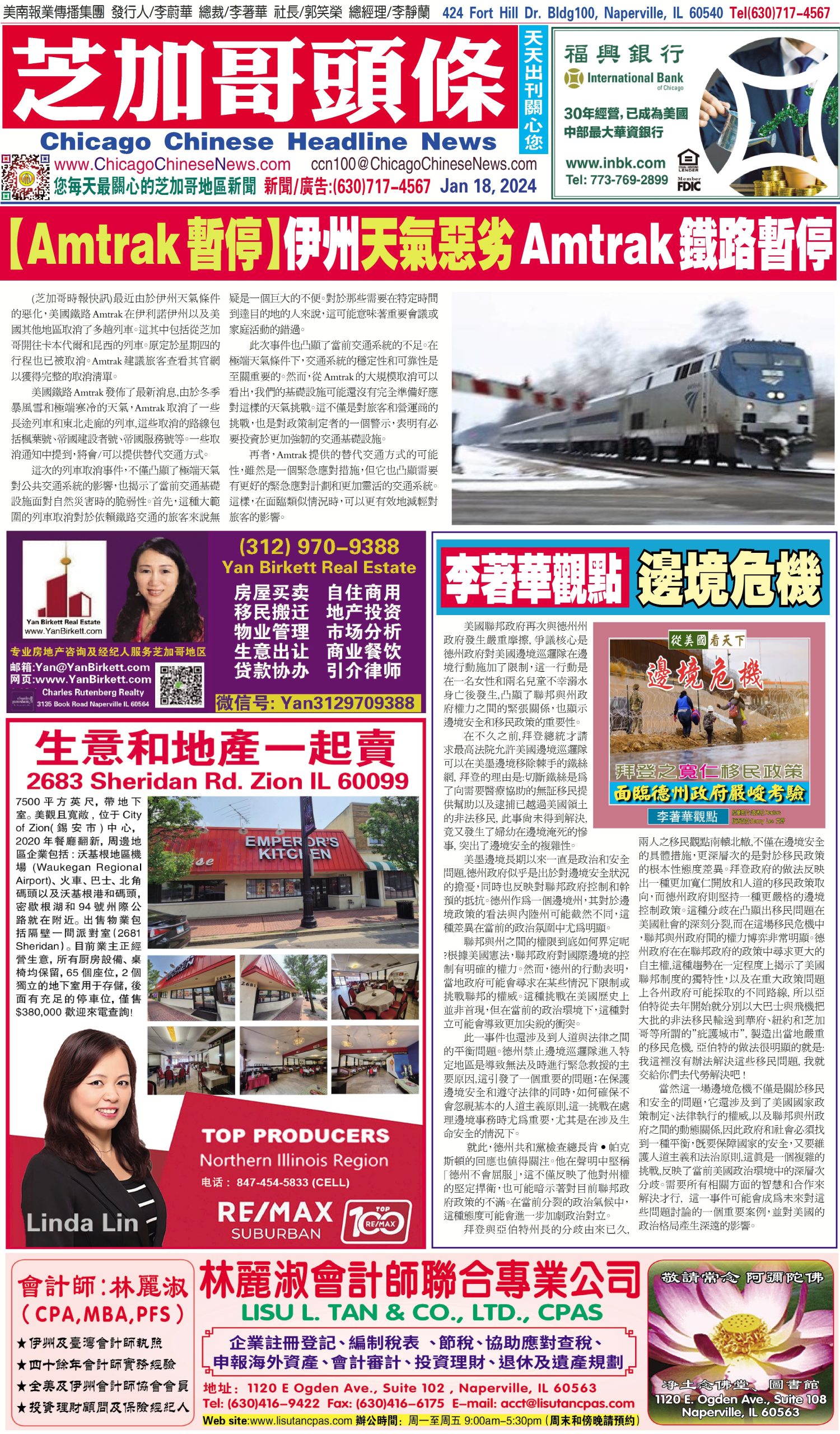 芝加哥頭條01-18-24芝加哥頭條【Amtrak暫停】伊州天氣惡劣Amtrak鐵路暫停 Share this: Share on X (Opens in new window) X Share on Facebook (Opens in new window) Facebook Like Loading... Related