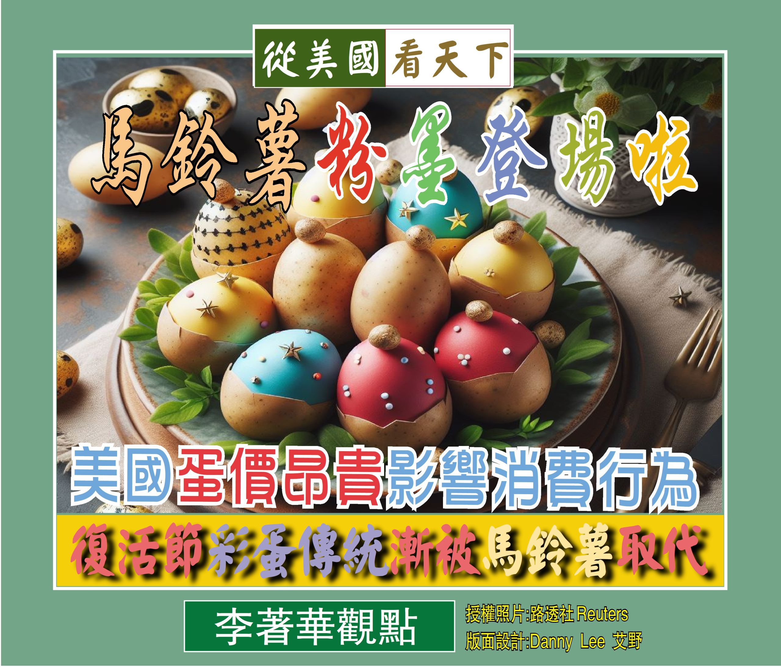 根據美國聯邦儲備銀行所公佈的最新數據,目前美國一打雞蛋平均價格約為 3 美元,雖然比起 2023 年 1 月份的歷史高點 4.82 美元有所下降,但仍是 2020 年 2 月份疫情前平均價格 1.45 美元的兩倍以上, 所以許多人基於價格的考量而改變了復活節的行為模式。市場研究公司 Numerator 的調查發現,65% 的人表示仍會購買彩蛋,然而竟有 35% 的人表示不會再購買彩蛋,寧願以馬鈴薯作為替代品。調查也發現,在減少或不購買彩蛋的人群中,有 25% 的人將高價視為主要因素, 所以價格決定了行為模式, 復活節彩蛋傳統漸被馬鈴薯取代似乎就是一個趨勢所向。