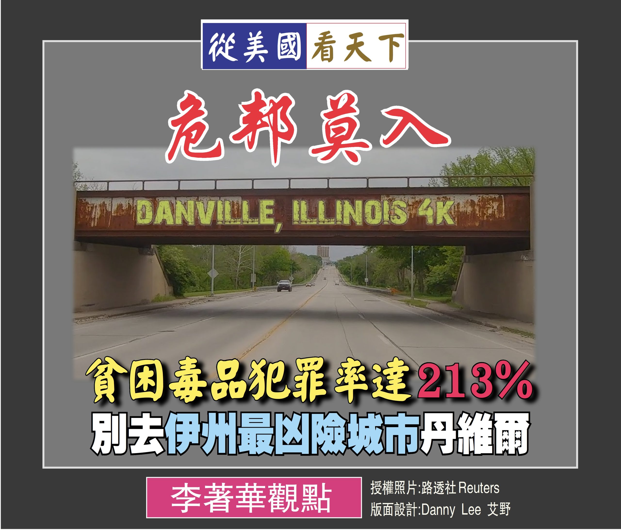 美國聯邦調查局 (FBI) 公佈了最新數據,伊利諾州治安最差的城市並不是惡名昭彰的芝加哥市,而是一般人不太留意到的丹維爾市(Danville), 這個城市不但貧窮, 而且毒品氾濫成災,其犯罪率是全州平均值的 213%,在 30,479 人口的丹維爾市,每17人中就有一人成為任何類型犯罪的受害者,凸顯了這個危險城市在公安的嚴峻挑戰。