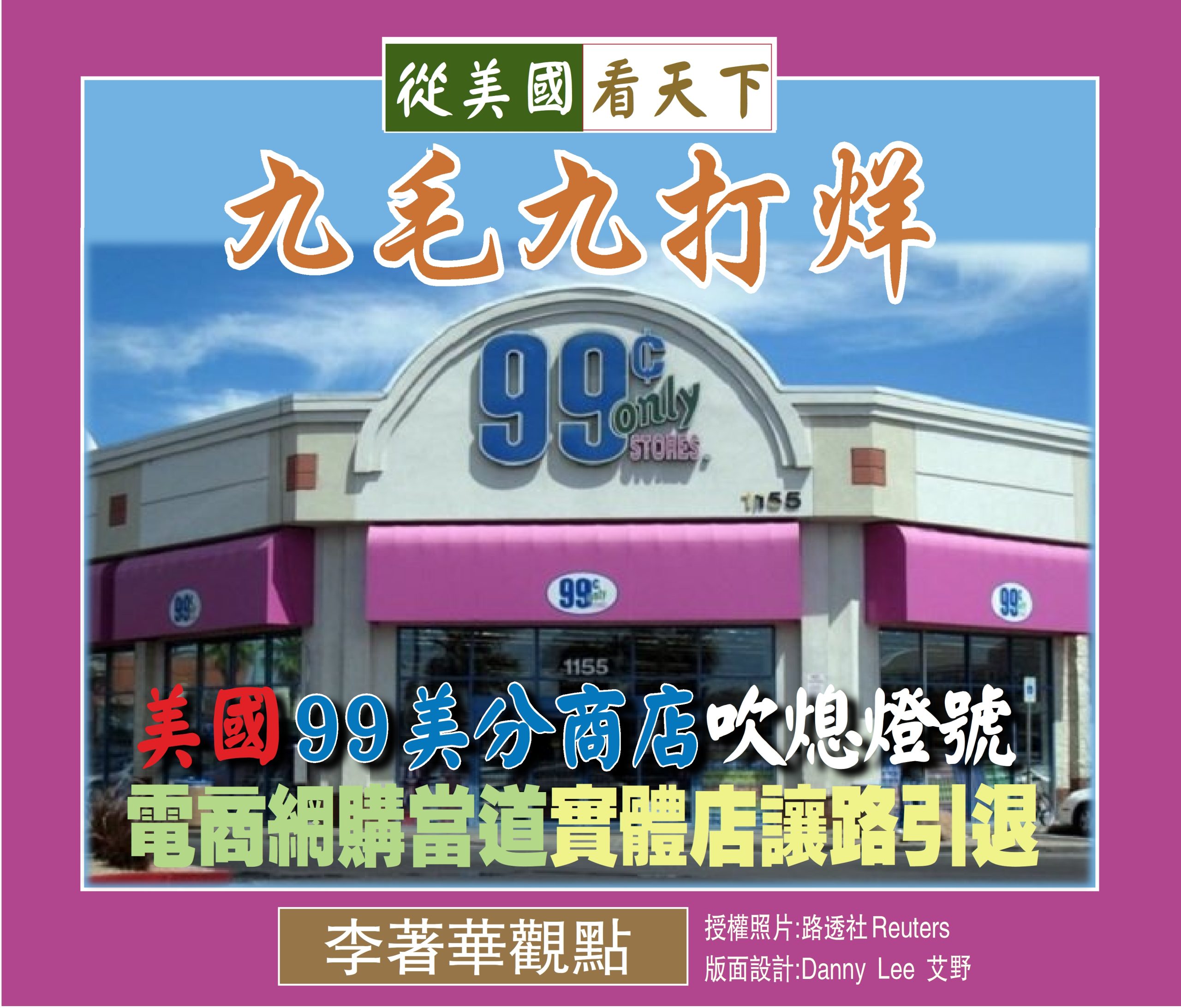 在美國具有40年悠久歷史, 14,000名員工的廉價折扣連鎖店九毛九(99 Cents Only Stores) 突然宣佈要關閉全美371家店面, 無獨有偶, 另外一家名為”一元家庭折扣店”( Family Dollar)也計劃要關掉1000家店鋪,這一連串的關店不僅揭示了實體店面臨電商網購的嚴峻挑戰,也反映了在特定環境下生存之不易。