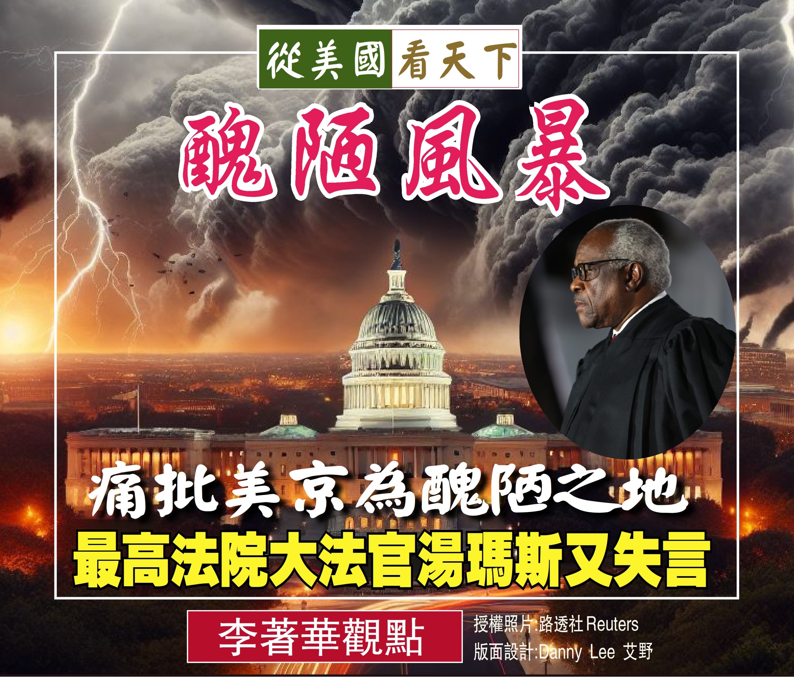 美國最高法院最保守的大法官克拉倫斯·湯馬斯(Clarence Thomas) 日前在阿拉巴馬州舉行的巡迴上訴法院會議上演講時公然放言痛批美國政治中心美京為”醜陋之地”, 他並抱怨近年來他自己與妻子Ginni遭受到各界惡意的攻擊和謊言是”令人難以置信的”, 湯馬斯强辯,他和妻子一直享受在全國各地用RV旅行的樂趣,因為這讓他們能夠接觸到普通人,而這些人不以做壞事為榮。
