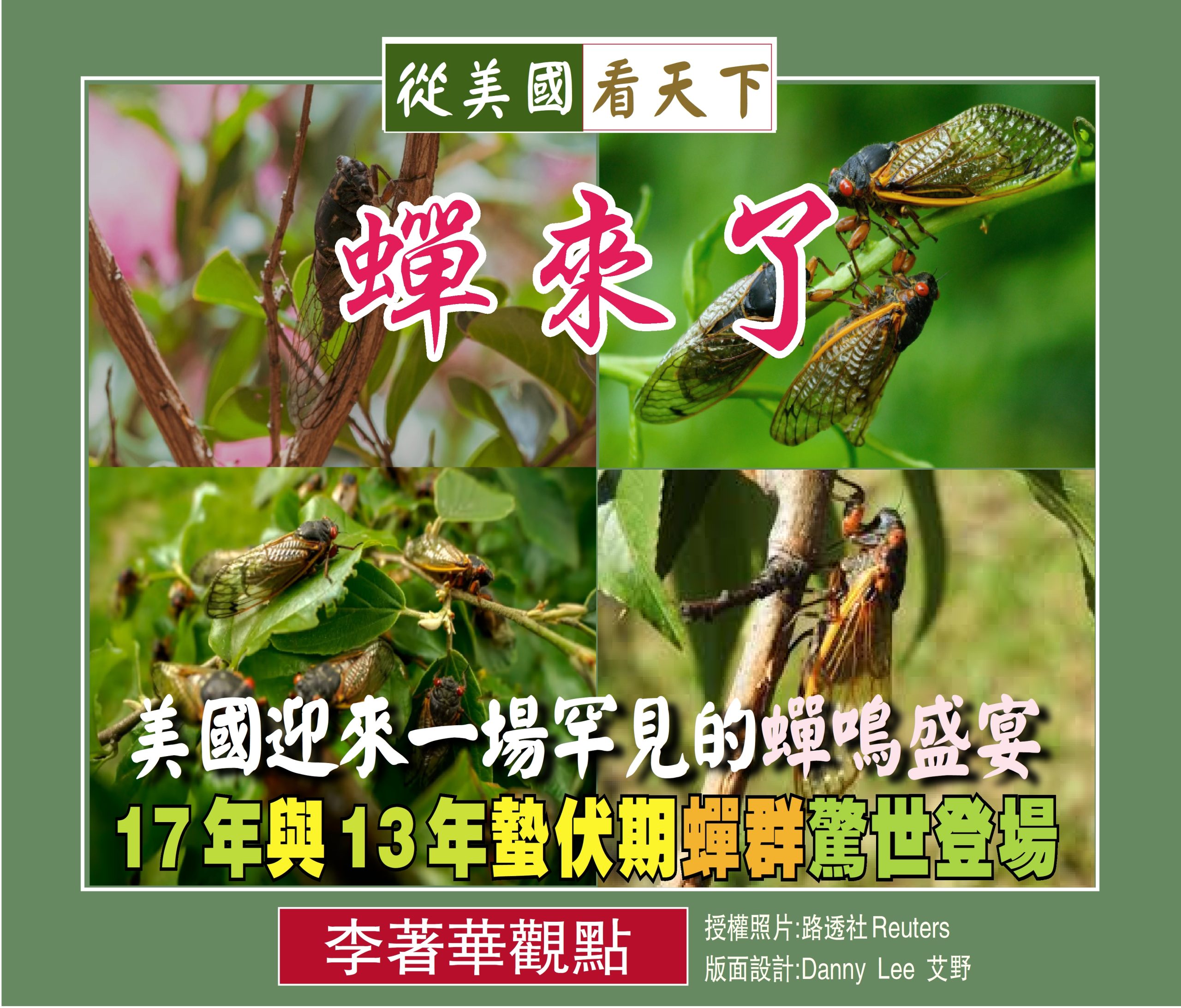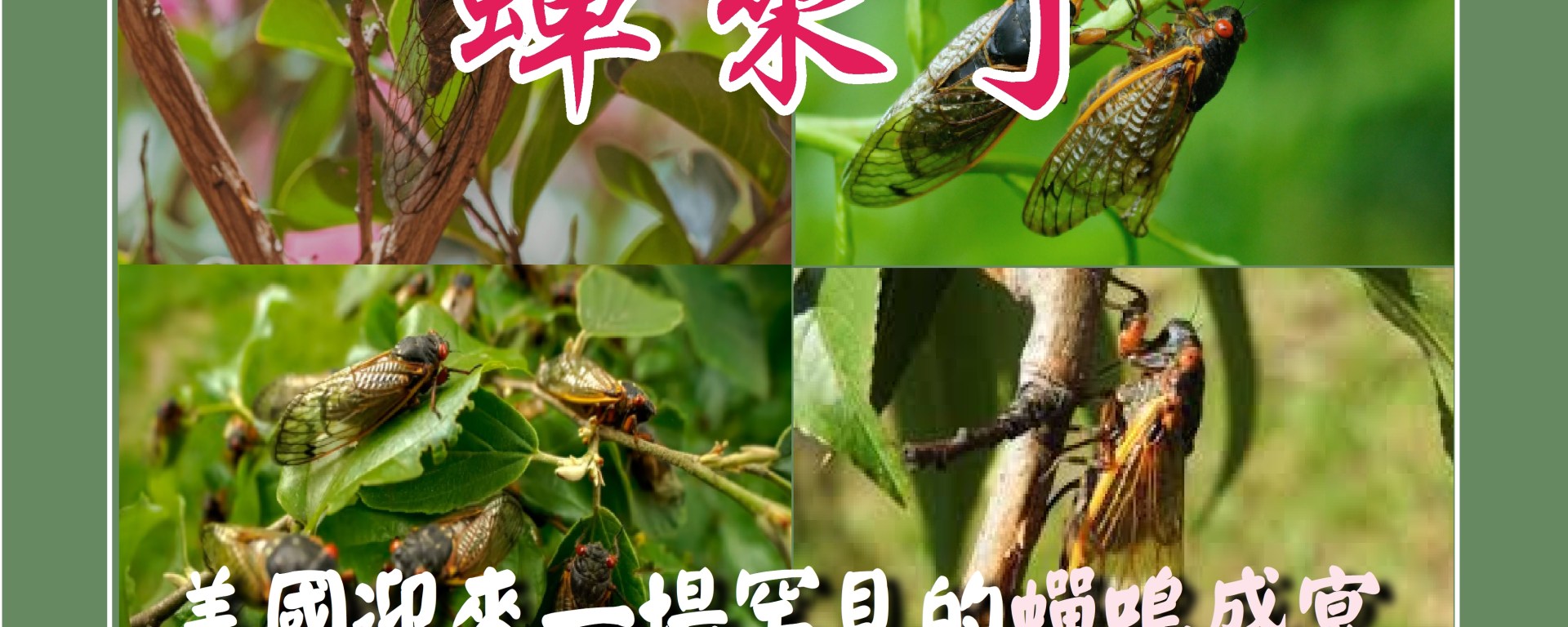 美國正迎來一場兩百多年以來極為罕見的蟬鳴盛宴–兩大蟬群—XIX群和XIII群已在喬治亞、南北卡羅來納、阿拉巴馬、密西西比、田納西、阿肯色、肯塔基和密蘇裡州現身,這些蟬每隔13年和17年分別出現一次而且兩群蟬同時出現的情況非常罕見, 數量達到數十億至一兆隻之多,伊利諾州預計在五月底至六月初也會有數十億隻蟬蟲將從地下湧出,爬上樹木,交配並生出幼蟲,17年後這些幼蟲也將重複相同的週期,牠們擁有驚人的紅色眼睛,看起來可能很邪惡,但不會對人類或其他動物構成威脅。