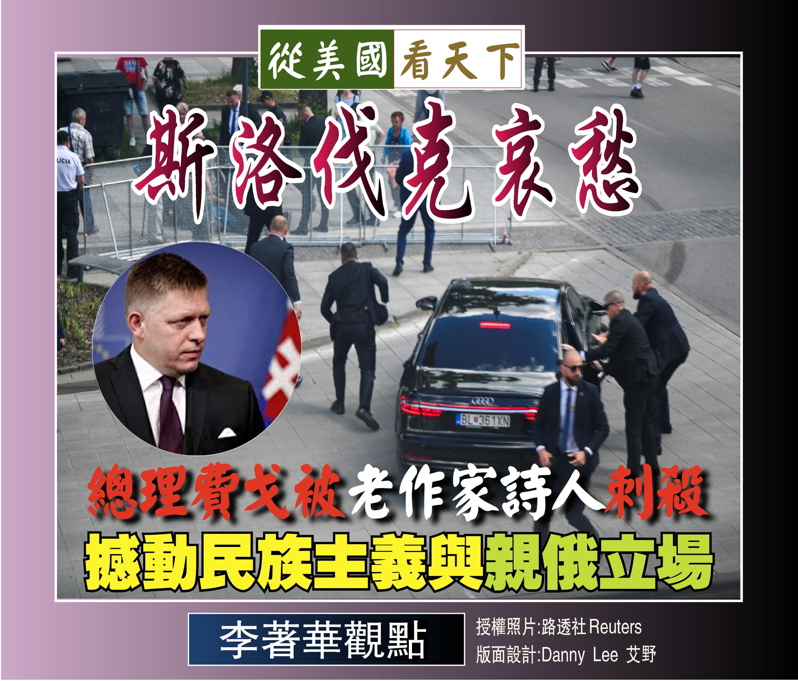 位於歐洲內陸國家”斯拉夫人之地”斯洛伐克(Slovakia)總理羅伯特‧費戈在一個文化中心外對公眾演講結束後在上車前突然遭到槍手擊中五槍,被送往醫院急救逃過死劫,槍手是一名71 歲的老作家詩人, 他在被逮捕時高喊:”我對政府施政不滿,我們的媒體被清算了,我不同意費戈的政策!”, 所以這明顯是一次政治暗殺, 是一種非常惡質的報復手段, 已4度當選總理的費戈具有民意基礎與後盾, 在他主政下反對烏克蘭,親近俄羅斯,何罪之有? 歹徒誰為為之?孰令聽之!
