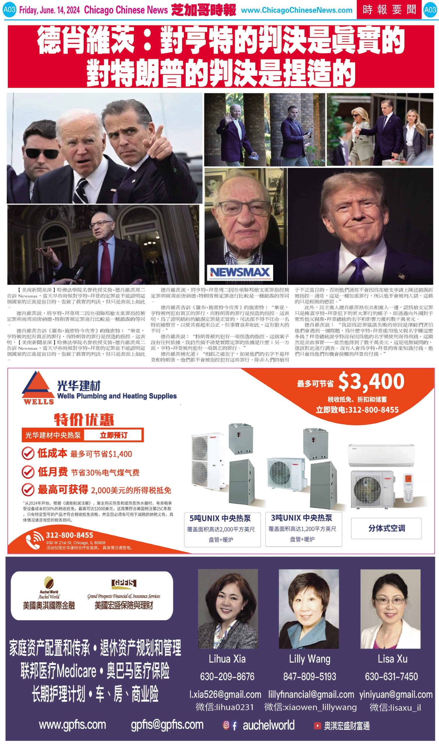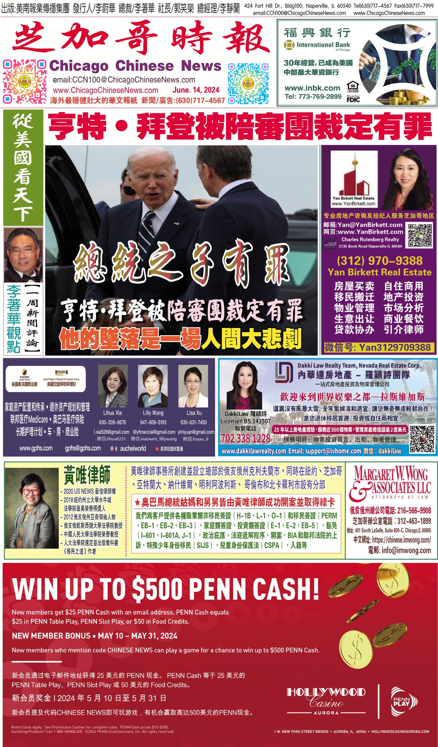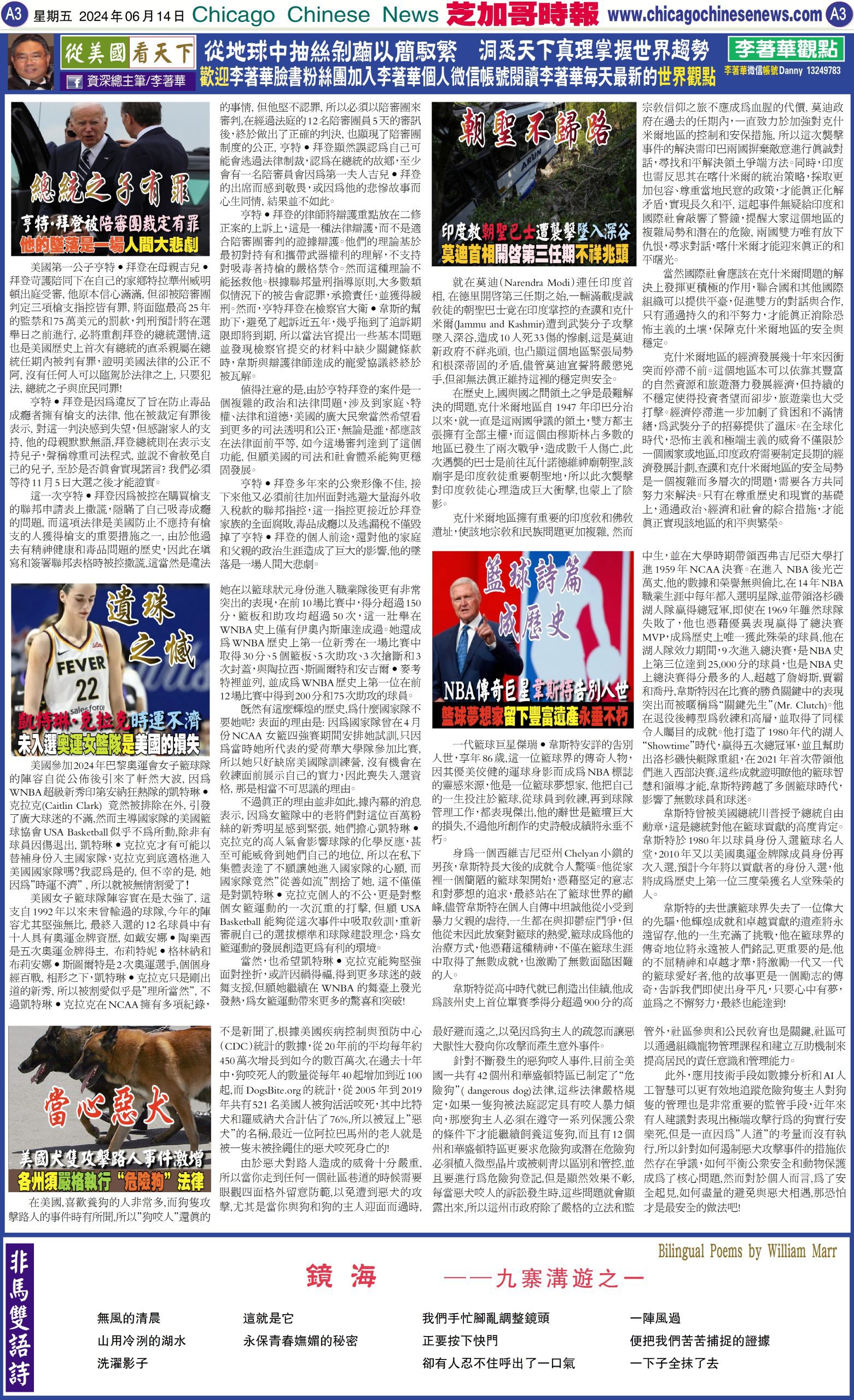 芝加哥頭條, 芝加哥時報06-14-24芝加哥時報【李著華觀點: 總統之子有罪–亨特•拜登被陪審團裁定有罪‧他的墜落是一場人間大悲劇】 Share this: Share on X (Opens in new window) X Share on Facebook (Opens in new window) Facebook Like Loading... Related