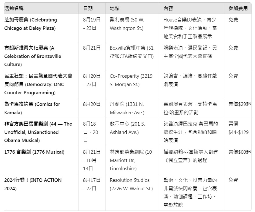 這些活動展示了芝加哥豐富的社區生活和文化氛圍,即使不參加大會的核心活動,居民和遊客也能充分感受到這座城市在民主黨全國代表大會期間的獨特魅力。