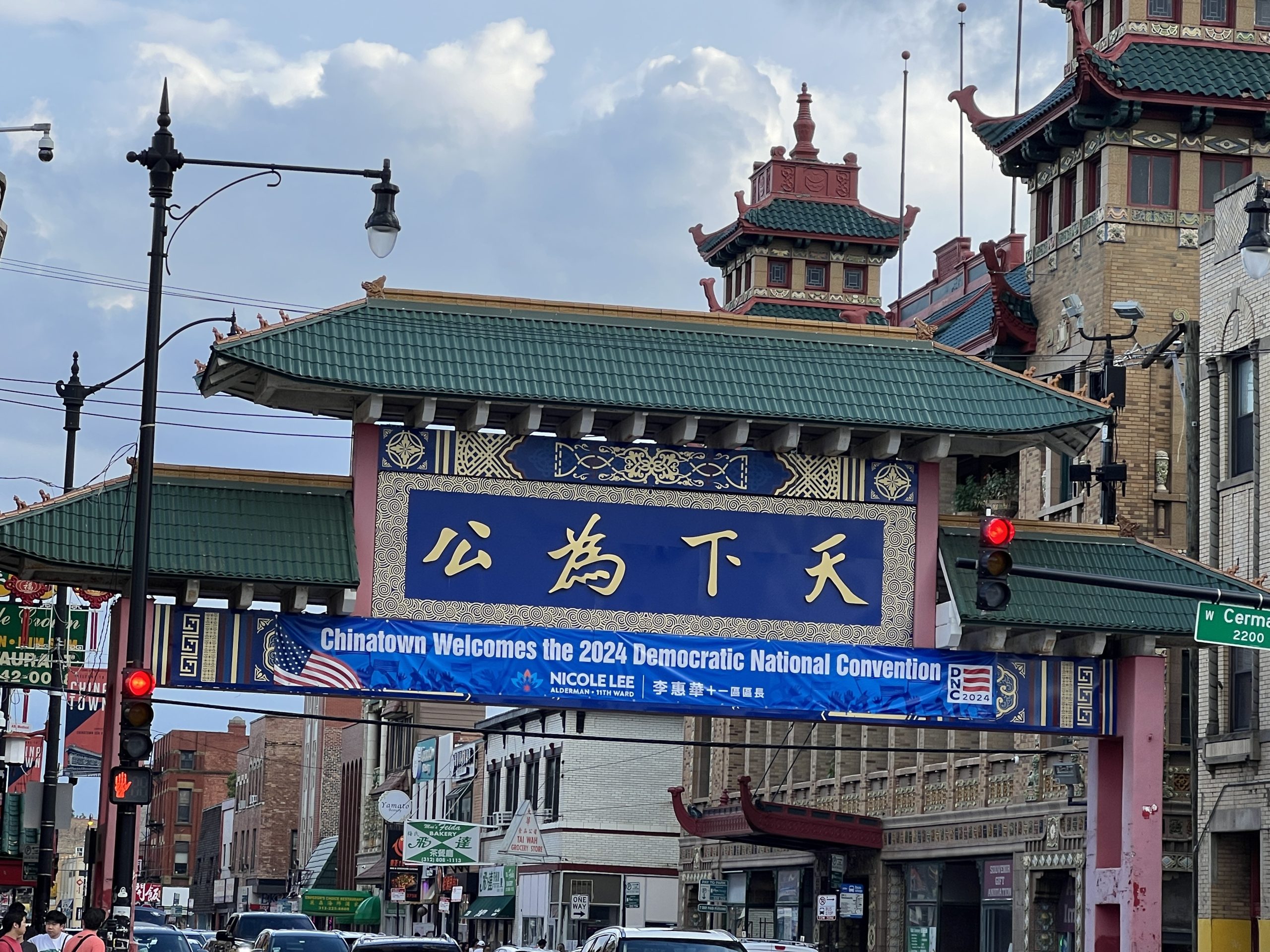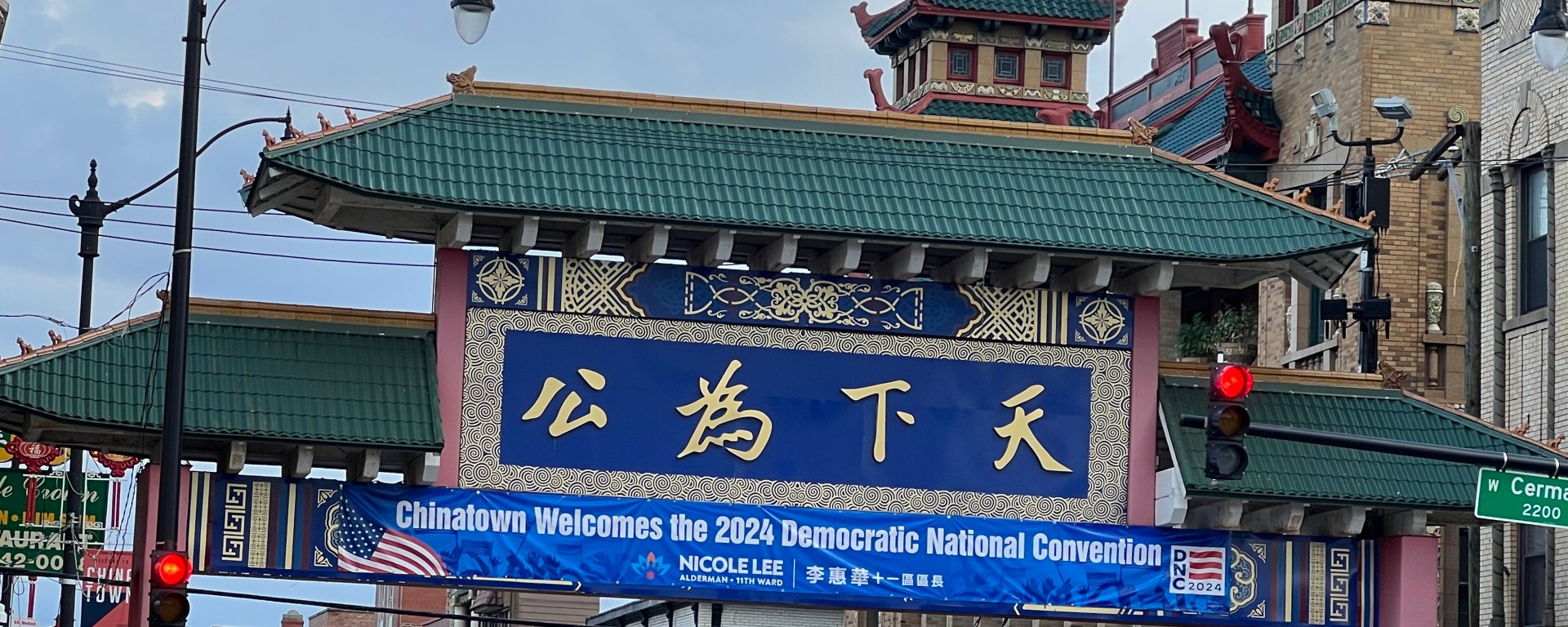 中國城區長李惠華在天下為公牌樓上掛上歡迎各界代表蒞臨芝加哥的横輻(本報記者郭笑榮攝影)