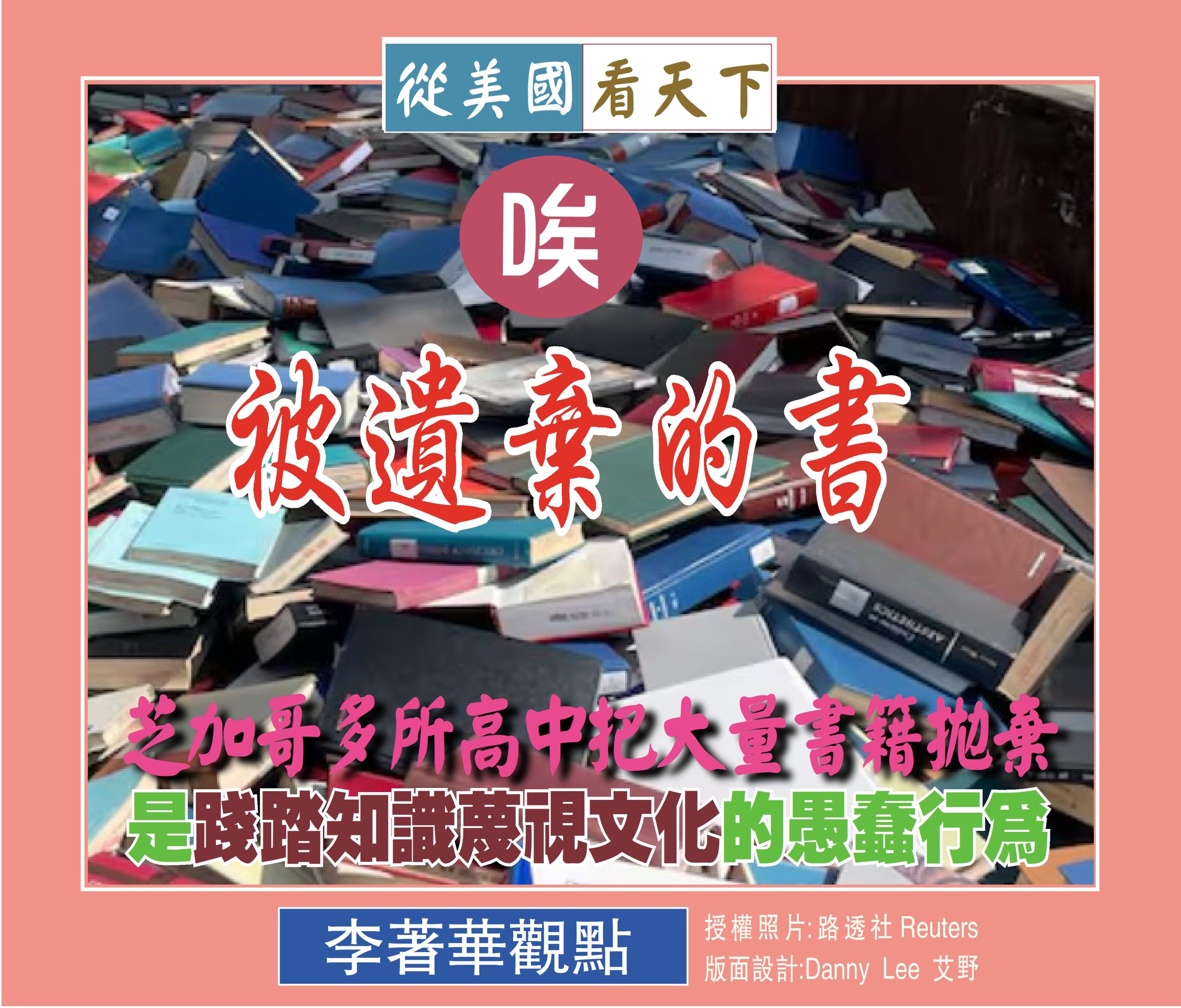 近日主流媒體報導,包括芝加哥西北部的卡爾舒茲高中以及多所學校竟不約而同在清除學校圖書館的存書, 成堆遭到廢棄的平裝圖書和教科書堆滿了各校的垃圾桶,各種書籍從莎士比亞詩集到物理學教材應有盡有, 從芝加哥 CBS新聞所播出之視頻中可見到的書籍包括《甲蟲與天使:一個男孩從難民營到哈佛的非凡旅程》和奧古斯特·威爾遜的《圍欄》等名著,電視台記者說道:” 這並不稀奇, 近年來大量書籍被芝加哥公立學校拋棄屢見不鮮, 因為他們說, 在電子書的時代, 淘汰紙本舊書和過時書籍是校方為了維護圖書館藏書的常見程式, 那並不足為奇!