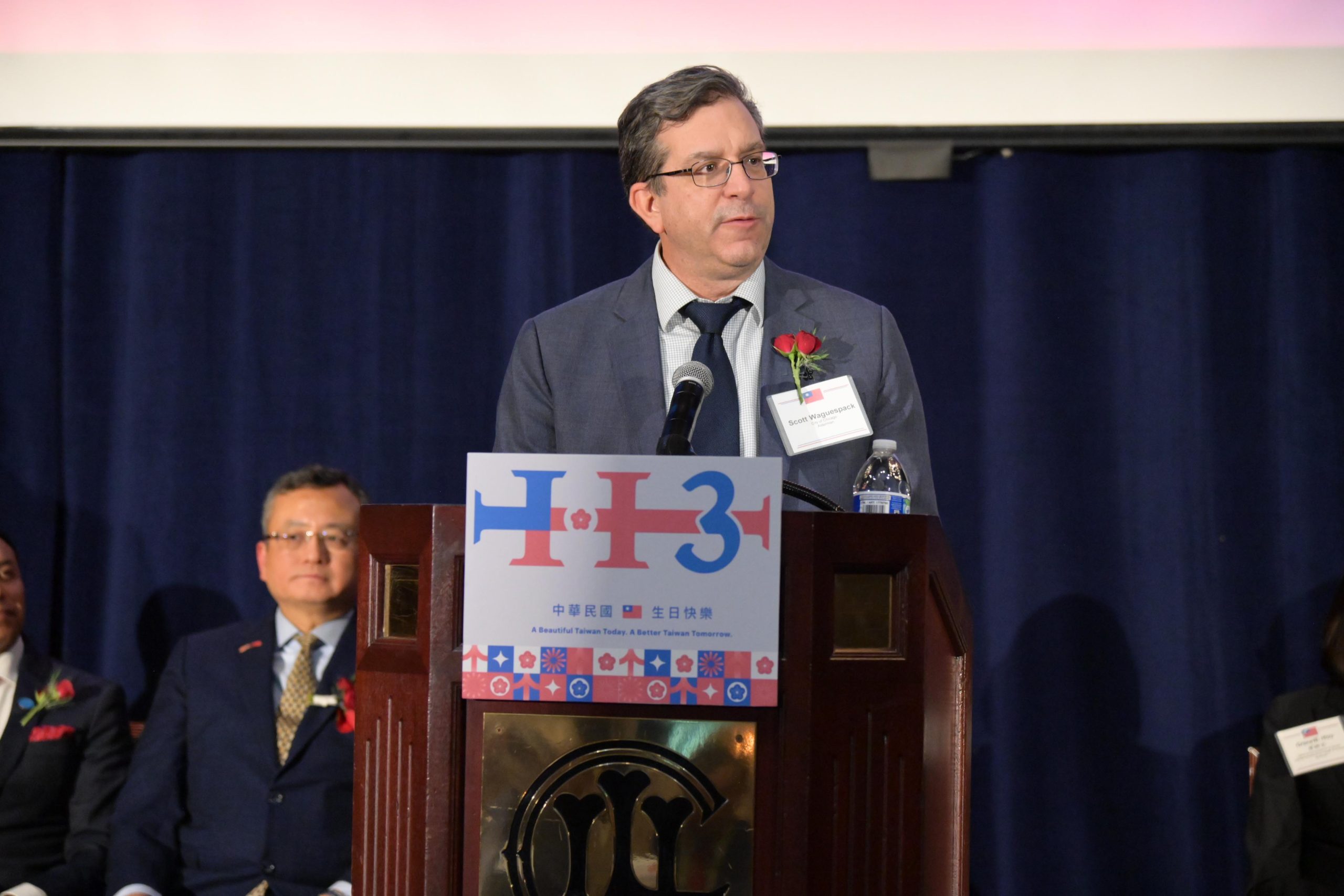 在全體與會貴賓⼀同齊唱莊嚴肅穆的中華民國與美國國歌後,酒會活動正式揭開序幕。類延峰處長致詞中強調,美台是基於共同價值觀的安全與經濟夥伴,堅若磐石的美臺夥伴關係是一種自然的聯盟。