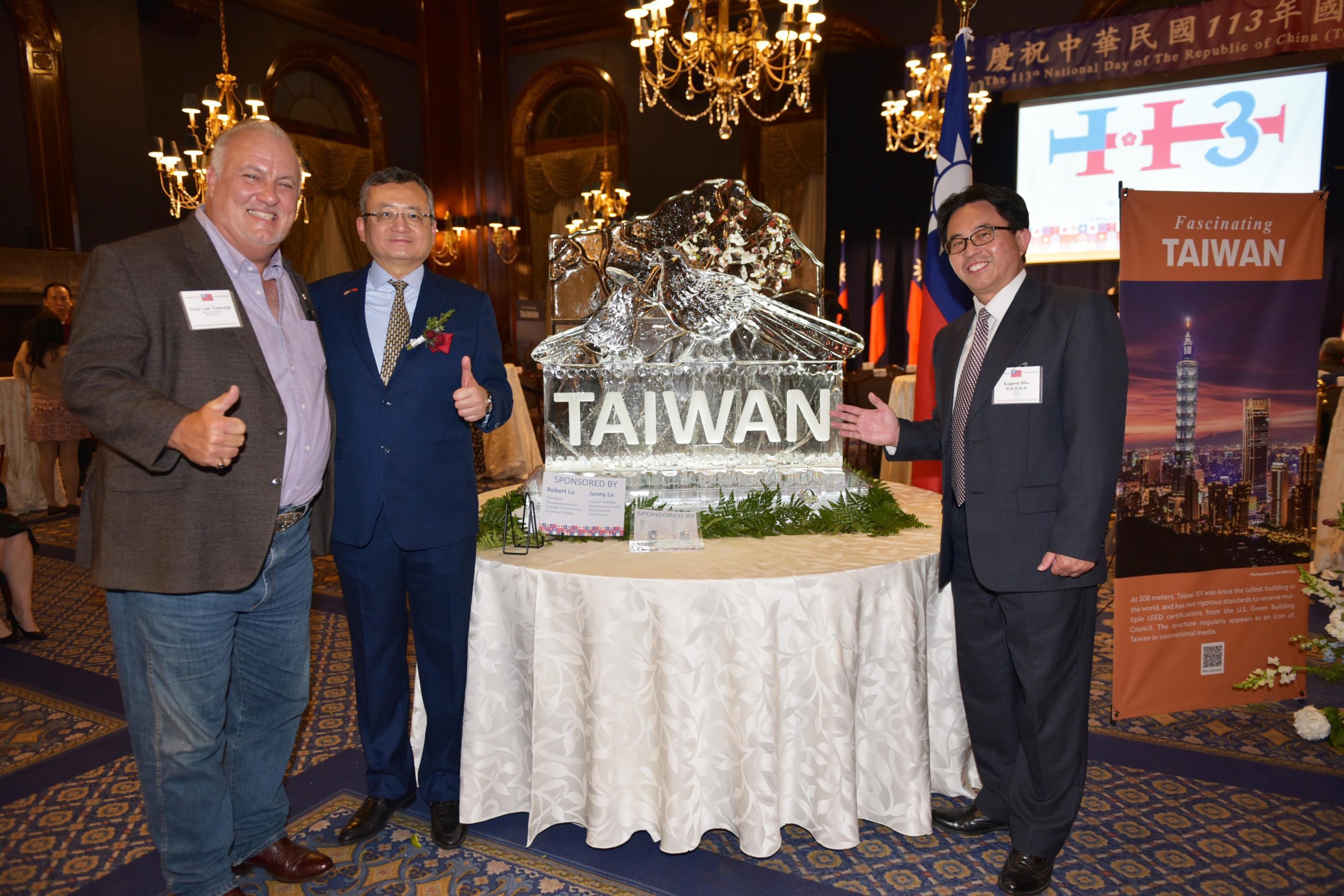 接著,與會貴賓副州長侯炳文,⽅仲華,各州與芝加哥友台連線主席以及中華會館主席項邦珍等相繼獻上祝賀後,類延峰處長便邀請政要嘉賓⼀同舉杯同慶雙⼗國慶⽇快樂。酒會現場除了有道地的臺式佳餚,還有許多美式精緻餐點、⾹檳紅酒與各式飲品供現場賓客取⽤。雙⼗國慶酒會的主視覺現場設計為⽃⼤的TAIWAN字體搭配臺灣藍鵲與梅花,並以冰雕⽅式呈現,旨在傳遞中華民國堅忍不拔的精神。
