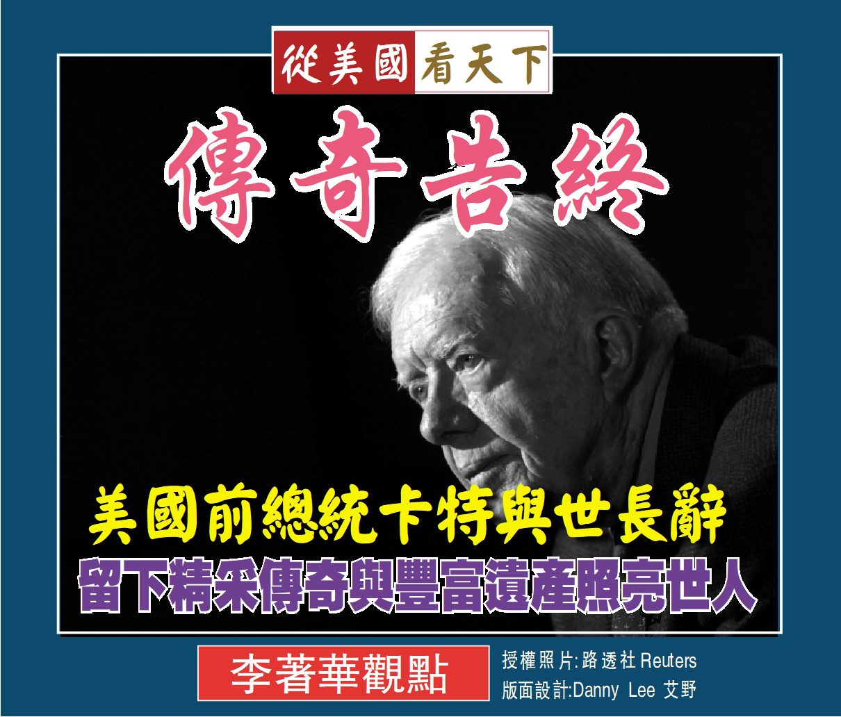 在年終歲末之際, 美國前總統吉米卡特揮手告別人世, 享年100歲, 算是福壽善终 。這位”花生總統”雖然只在白宮做過一個任期, 但是他以道德良心為基石從政,堪稱為美國歷任總統中最重視人權與和平的政治家, 他在短短的四年內留下了豐富的遺產, 而在卸任總統後他與夫人羅莎琳把自己的餘生都奉獻給了全人類的健康與福祉共同創立了卡特中心, 非常了不起, 所以被評选為諾貝爾和平獎, 的確是實至名歸。