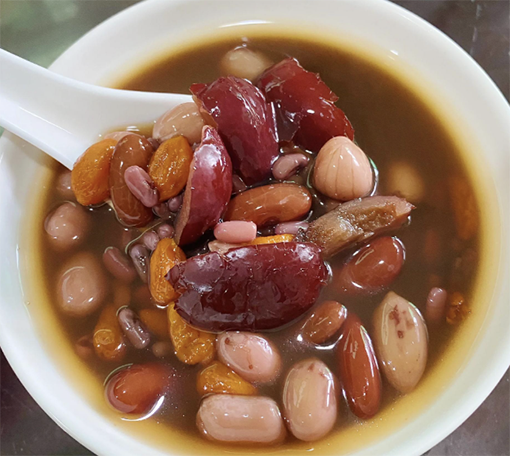 五紅湯,由紅豆、紅棗、紅皮花生、紅糖和紅枸杞,五種紅色食物組成。