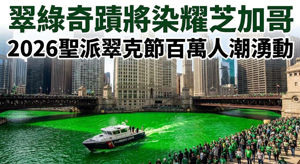 ( 芝加哥時報 / 快訊 )今天是 2026 年 3 月 14 日,芝加哥將迎來全美最受矚目的年度盛事——聖派翠克節(St. Patrick’s Day)慶典。今日上午 10 時整,芝加哥河岸兩側將被圍得水洩不通,數以萬計的市民與全球遊客屏息以待。隨著芝加哥水管工工會(Plumbers Local 130)的機動船隻緩緩駛入河面,神秘的橙色粉末撒入水中,在短短幾分鐘內,河水奇蹟般地變成了鮮豔奪目的翠綠色,現場隨即爆發出排山倒海般的歡呼聲。