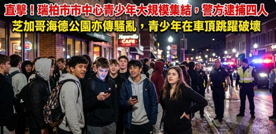 ( 芝加哥時報 / 快訊 )伊利諾州瑞柏市(Naperville)警方表示,該市市中心發生一起大規模青少年與年輕人聚集事件,導致四名未成年人被捕。根據警方掌握的社交媒體影片顯示,當時現場約有三百名年輕人聚集。被捕的四名青少年被控以毆打罪,另有多人因非法侵入及違反城市條例而被傳喚。
