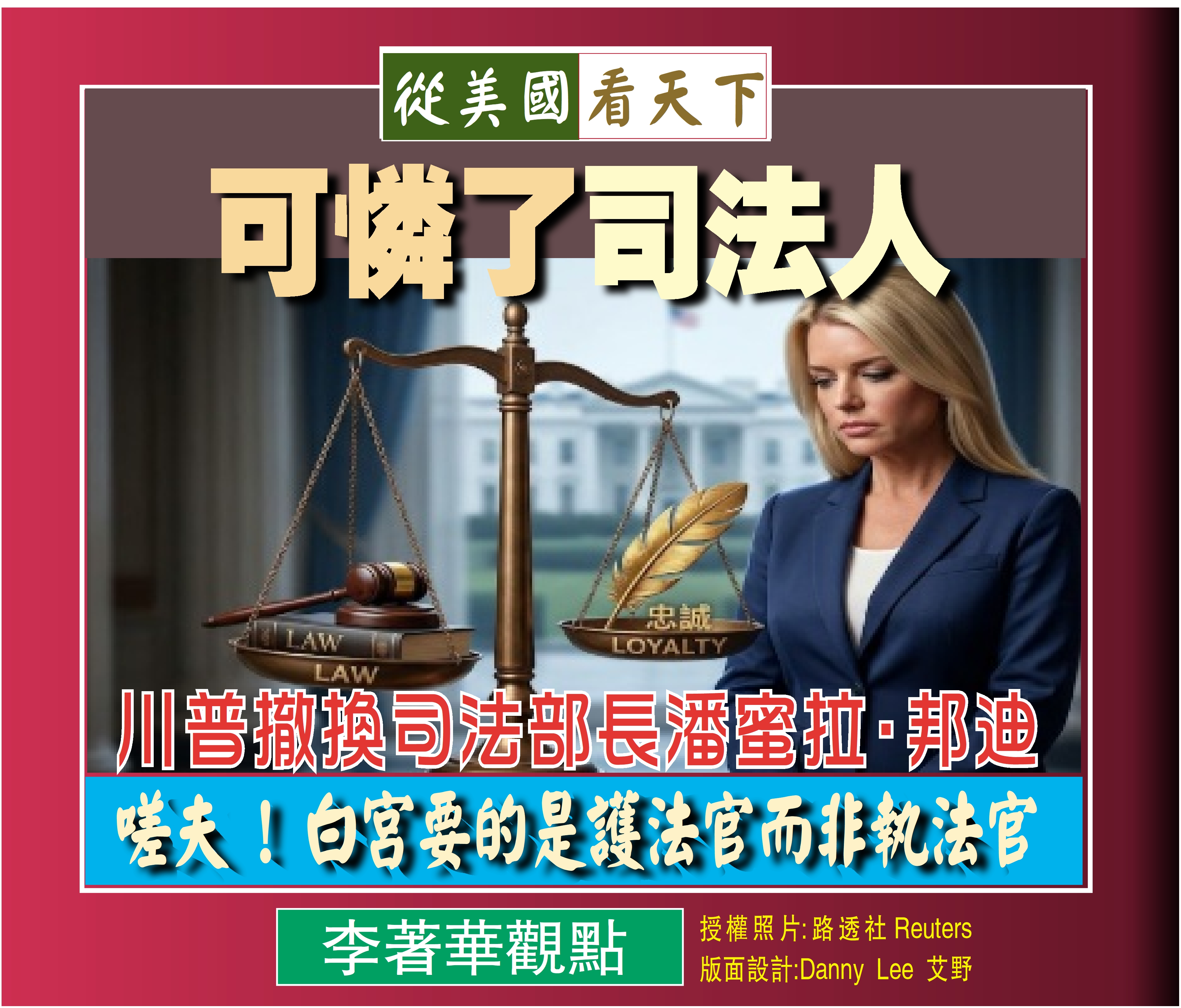 此次司法部長遭撤換並非孤立事件。回顧過去,從傑夫·塞申斯(Jeff Sessions)到威廉·巴爾(William Barr),川普在兩個總統任期内始終是在尋找那個能為其衝鋒陷陣的司法首長。邦迪曽被寄予厚望,以其對川普的忠誠和積極而聞名,如今卻因未能在針對政敵的追訴上展現「戰鬥力」,以及在艾普斯坦(Jeffrey Epstein)檔案公開上的守法執行而慘遭清洗。這證明了在現今政治叢林中,技術官僚的專業與法治的嚴謹,敵不過領導人對於「絕對忠誠」的飢渴與變幻莫測的願望, 哇, 這真是美國版的 ”忠誠不絕對,就是絕對不忠誠” 呀!