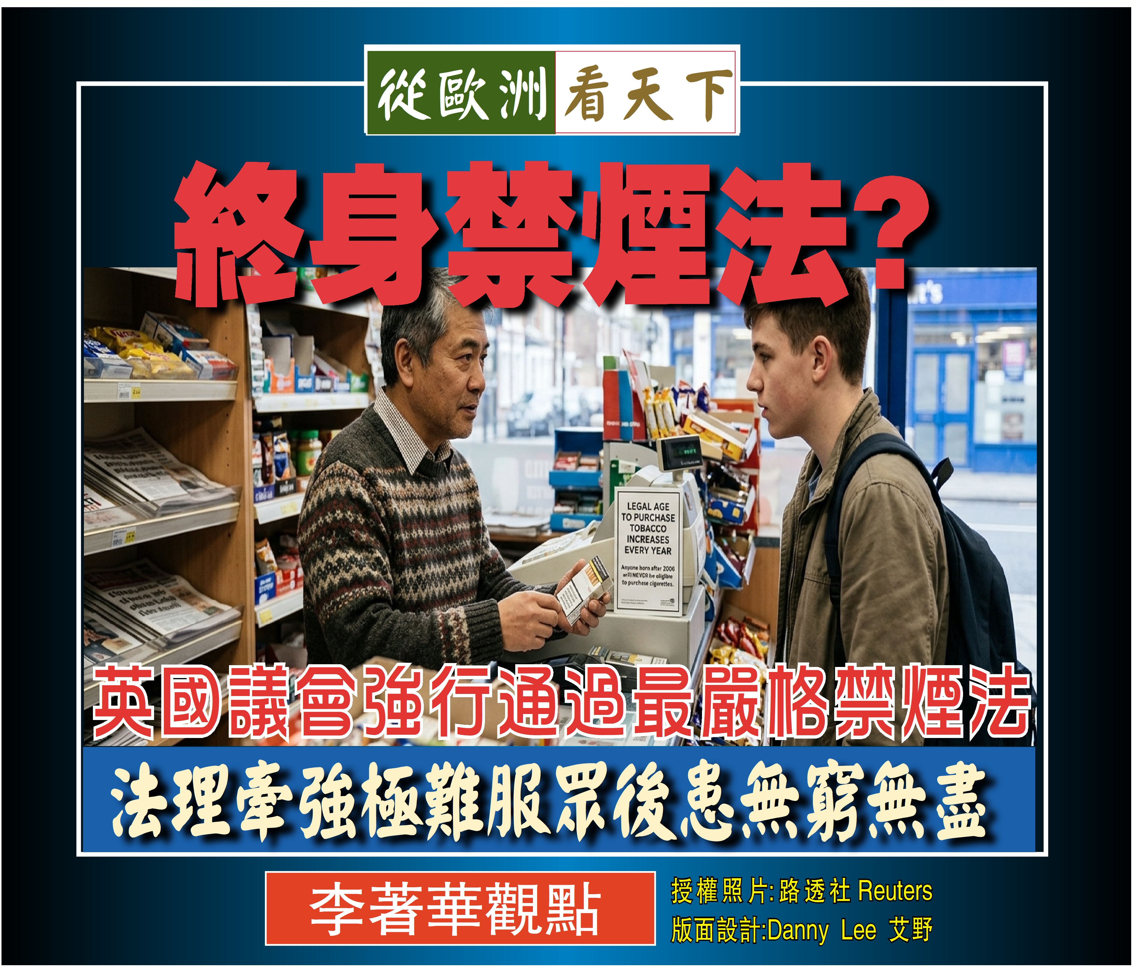 政府試圖在傷害發生前就將其扼殺,這種治理雖具前瞻性,卻也隱含著剝奪個人意志的風險。英國的「英倫實驗」能否成功,取決於其能否在健康天平與自由代價之間找到平衡。在邁向集體健康的康莊大道上,我們是否正不經意地交出了個人意志的最後一把鑰匙,這場博弈的結果,全球都在靜觀其變。誠形乎外而效必應,唯有在法治韌性與人性欲望間尋得公約數,這場公衛變革才能真正跳脫斷菸絕代的定局,走向長治久安的坦途。
