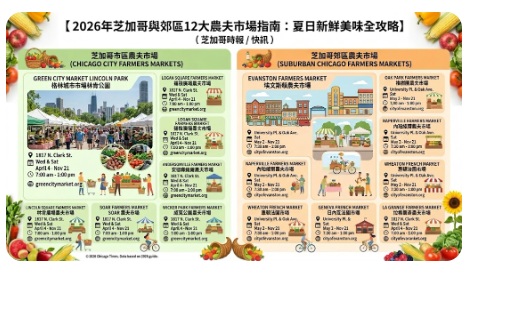 ( 芝加哥時報 / 快訊 )隨著 2026 年夏季腳步臨近,芝加哥及周邊郊區的農夫市場季節即將於 5 月正式拉開帷幕。數十個社區市場將帶來最新鮮的在地農產品、手工藝品以及各式美食,為市民提供體驗城市生活與支持本地農業的最佳機會。以下特別為您詳列 12 個最具規模且深受好評的市場資訊,包含具體地點、開放時間及官方網址。