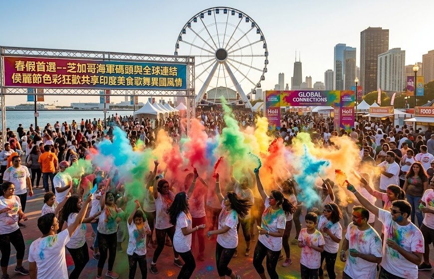 ( 芝加哥時報 / 快訊 )隨著春天的腳步臨近,芝加哥一年一度的春假旅遊旺季也即將拉開帷幕。芝加哥的地標性景點——海軍碼頭(Navy Pier)正式啟動了最受期待的春季活動——「2026 全球連結」(Global Connections)系列慶典。首場活動便以印度傳統、色彩斑斕的「侯麗節」(Holi)為主題,將海軍碼頭化為一片充滿歡樂、色彩與跨文化體驗的海洋,絕對是全家春假避暑、休閒娛樂的絕佳首選。