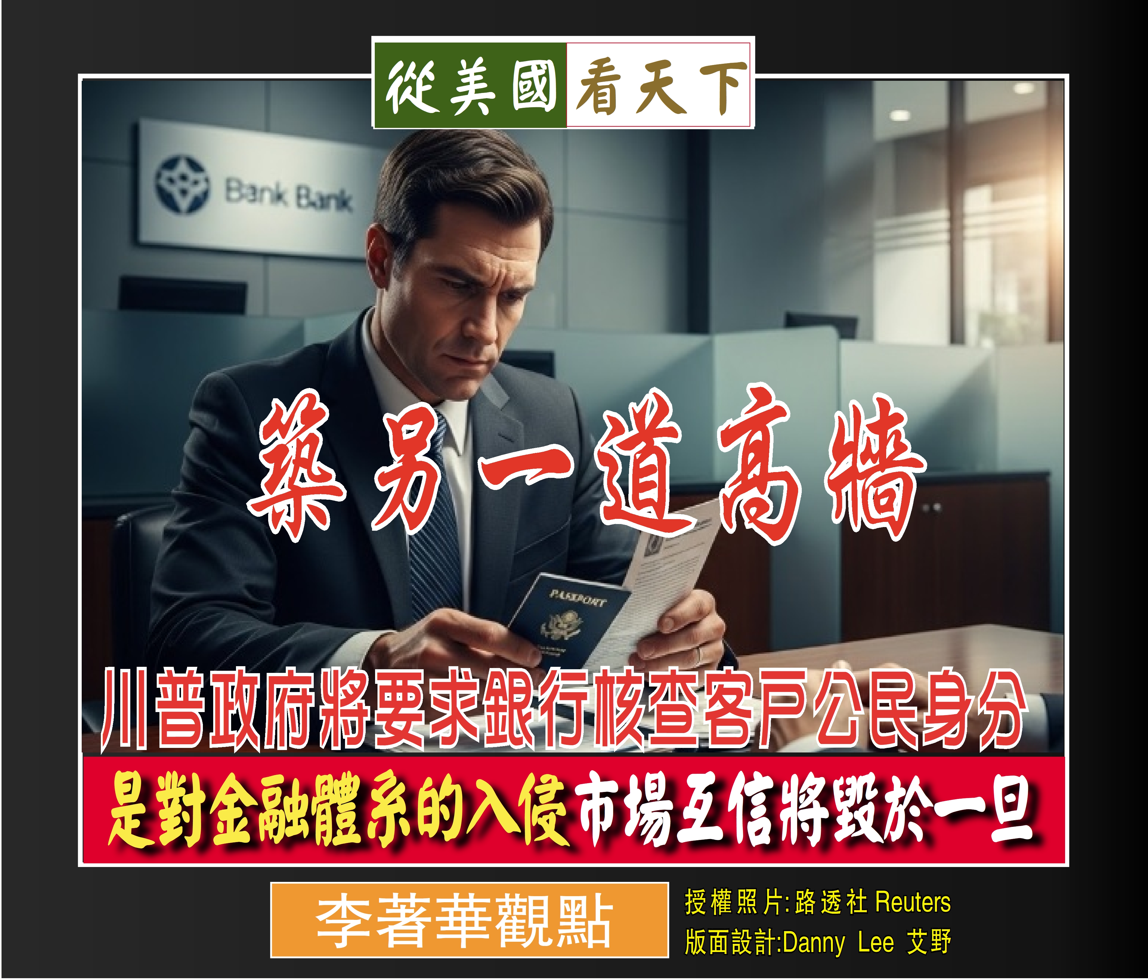 為了防止非法移民的進入, 川普曾經在美墨邊界築起了一道道的高牆, 現在川普正研議一項行政命令,要求美國銀行業核查現有及未來客戶的公民身份資訊。此舉被視為其強硬移民執法政策的延伸,旨在透過金融系統識別並追蹤無證移民。若法案落實,銀行將被迫要求客戶提供護照或公民證明等前所未有的證明文件。目前銀行界對此深感憂慮,擔心此項「不切實際」的操作將使金融機構淪為政府驅逐非法移民的工具,並對日常運作與客戶關係造成巨大衝擊。